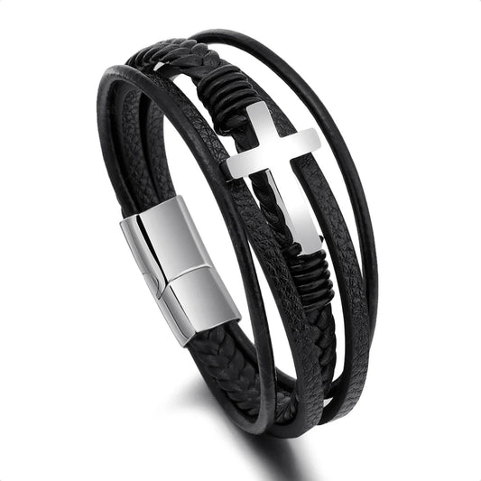 Men’s Black Leather Bracelet with Silver Cross – Multi-Layer Design